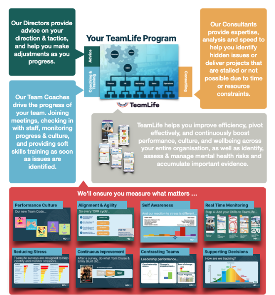 Our TeamLife Program is based on organisational psychology and behavioural science. We deliver our services via cutting-edge software and with targeted coaching.